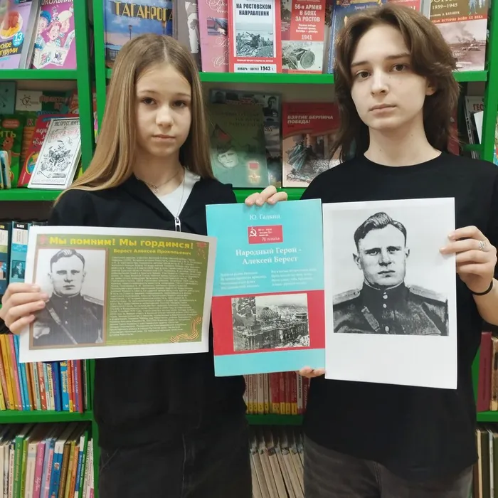 В рамках мероприятия в библиотеке для читателей прошел информационно – познавательный час «Подвигом славны твои земляки» с обзором материалов о жизни и подвиге героя Алексея Прокофьевича Береста.